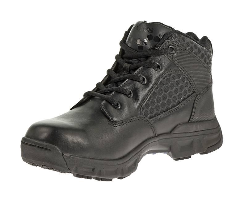 The Bates - Mens Code 6 4" boot is a lightweight and breathable option for everyday, tactical, or duty footwear. It features a leather and nylon upper, moisture-wicking lining and mesh tongue for ventilation, padded collar for comfort, removable cushioned insert for added comfort, and a slip-resistant rubber outsole for superior traction. Experience reliable performance and maximum breathability with the Bates Code 6.