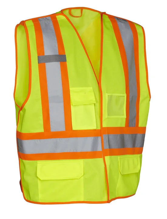 Introducing our 5-Point Tear-Away Hi Vis Traffic Safety Vest, crafted from durable 100% polyester tricot. Featuring a radio clip, cell pocket, and ID pocket, with added convenience of two lower Velcro closure pockets. Enhanced with retroreflective tape for optimal visibility. Available in three sizes for a perfect fit.