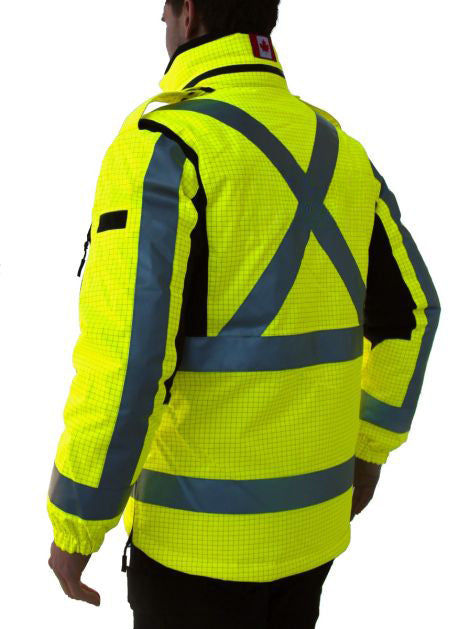 Highly visibility yellow soft shell teflon coated fabric combined with the highest 3M retroflective strips for maximum visibility and large visible cross on back. Completely lined. Meets CSA and ANSI standards.