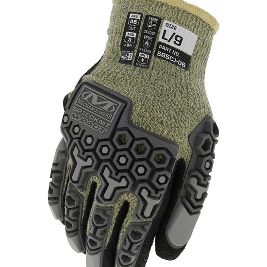 SpeedKnit™ M-Pact® FR S85CJ06 gloves protect hands working with energized equipment in environments where the risk of fire, arc flash, and cut hazards are present. Comfortable 13-gauge aramid blended machine knit shell conforms to your hands with anatomically designed flame-resistant TPR to protect your knuckles, metacarpals, and fingers from common impact and pinching injuries and meets the ANSI 138 level 2 impact standard. The S85CJ06 gloves are constructed with a blend of aramid fibers to protect hands with EN 407 Level 4 Limited Flame Spread and Level 2 Arc Flash as well as providing ANSI A5 level cut resistance. The palm side features a sandy neoprene and nitrile coating providing durable abrasion resistance and excellent gripping power in wet and oily conditions.