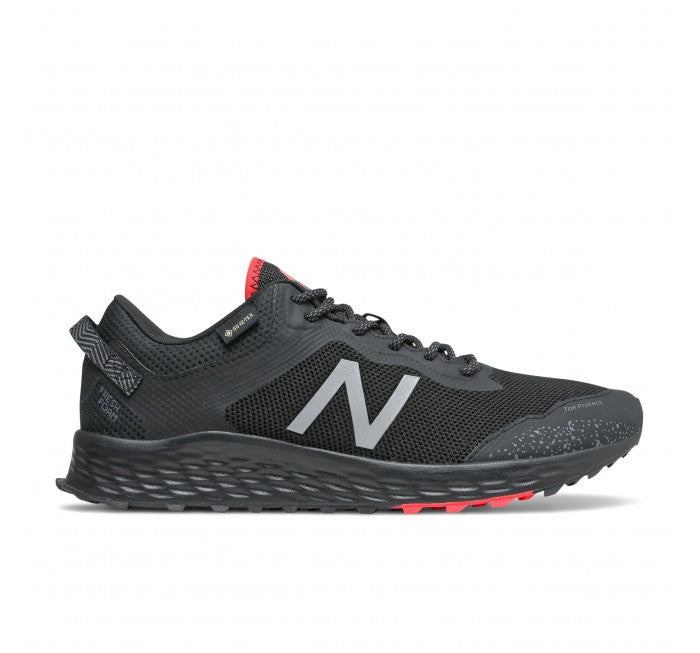The New Balance Fresh Foam Arishi Trail Running Shoe features a no-sew construction upper for a sleek fit and feel; GORE-TEX waterproof fabric providing wind, rain and water protection; and Fresh Foam midsole cushioning for an ultra-cushioned, lightweight ride. Its AT Tread outsole offers versatile traction during on and off-road activities, while the 8 mm drop and Toe Protect technology provides protection from rocks, roots and debris.